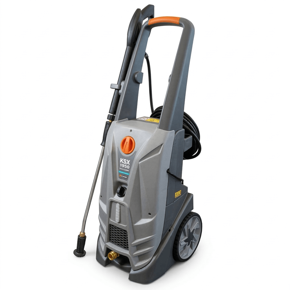 La hidrolavadora de alta presion Comet KSX 1950 Classic es la solución definitiva para quienes buscan un rendimiento semiprofesional con ingeniería italiana de vanguardia. Equipada con un robusto motor de induccion de 2800W (3,75HP) que opera a 2800 r.p.m., este modelo garantiza una durabilidad superior y un funcionamiento más silencioso comparado con motores universales convencionales. Su corazón técnico reside en una bomba axial con cabezal de latón y tres pistones de acero inoxidable de alta resistencia, diseñada para soportar usos intensivos sin pérdida de rendimiento.